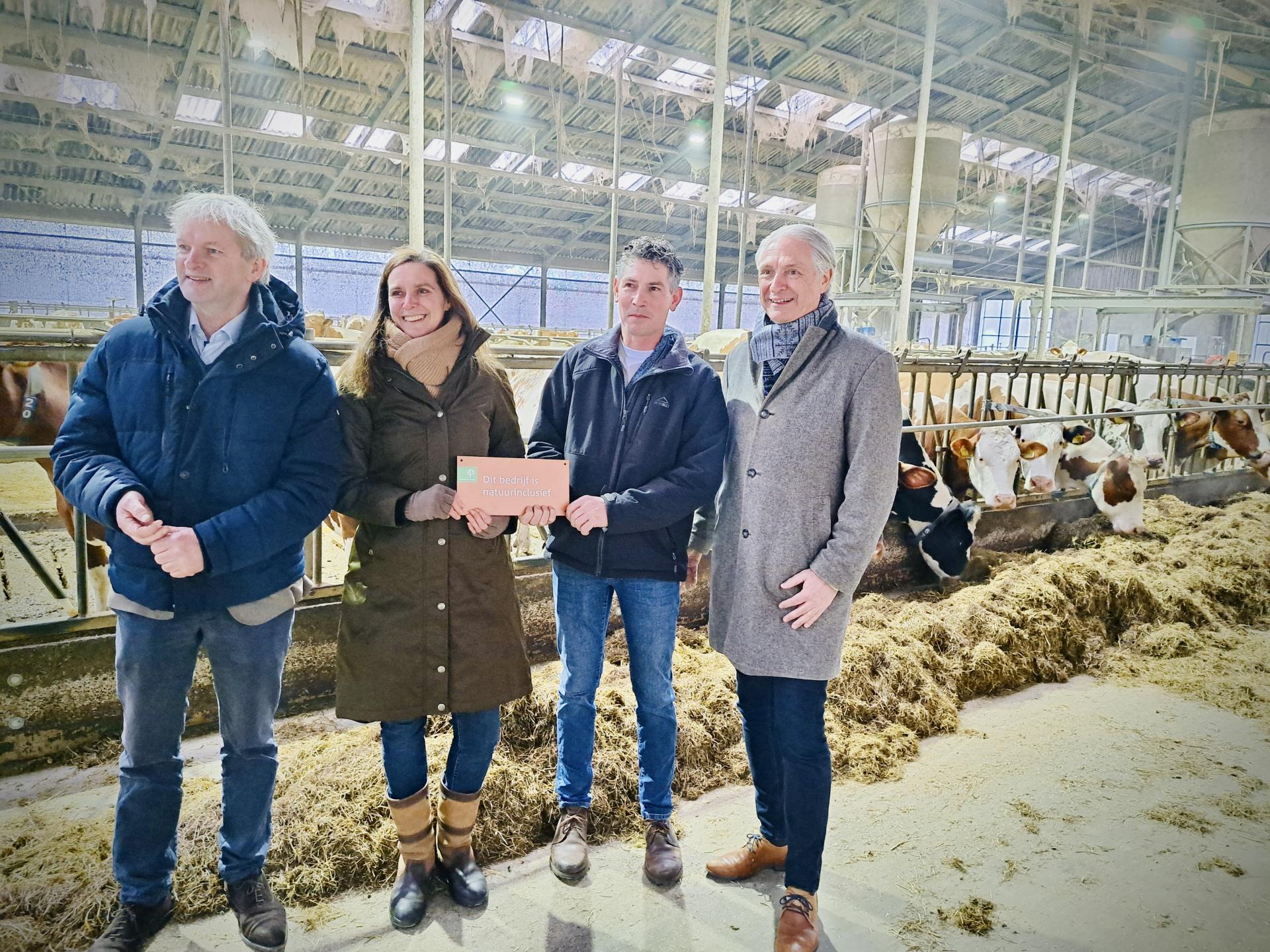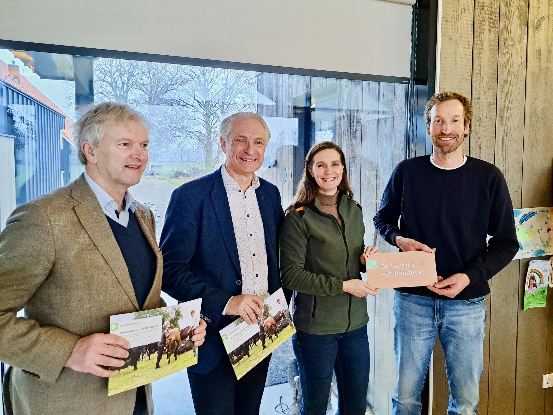 v.l.n.r. Maurits von Martels (Gedeputeerde Provincie Overijssel), Richard de Way (Wethouder Gemeente Dinkelland), Susan Bonekamp (Staatsbosbeheer), Chris Kotte (Biologische melkveehouder)